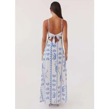 Faretumiya Women V Neck Cut Out Spaghetti Strap Long Dress Tie Up Bow Backless Bodycon Maxi Dress Party Wedding Y2K Streetwear(Floral Blue ,Medium)