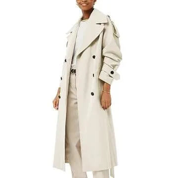 Farktop Womens Oversized Long Trench Coat Double Breasted Lapel Windproof Overcoat with Belt