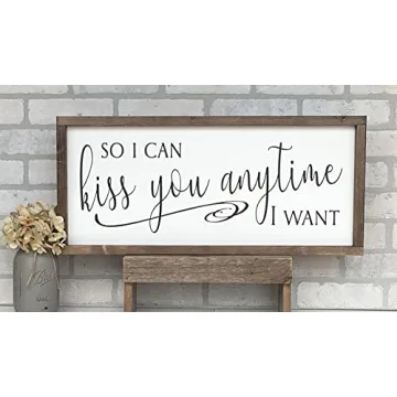 Show moreIntroducing the exquisite Farmhouse Framed Wooden Sign that brings a touch of rustic charm to your home with the endearing phrase "So I Can Kiss You Anytime I Want." Handcrafted with love in the USA, this original design showcases the perfect combination of artistry and functionality. Each sign is made from solid wood, ensuring a sturdy construction that speaks to its quality and durability. With a sawtooth hanger already attached, it’s easy to display, allowing you to instantly elevate your decor without any hassle.