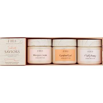 ... Show moreIndulge in the luxurious experience of soft, hydrated skin with the FarmHouse Fresh Skin Saviors Shea Butter Sampler. This exquisite skincare set includes three delightful moisturizing creams, each brimming with nutrient-rich shea butter renowned for its exceptional moisturizing and nourishing benefits. Designed for those with dry skin, these miniature creams offer exceptional hydration while effortlessly fitting in your bag or purse for on-the-go pampering.