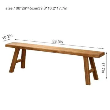 Show more Introducing the Farmhouse Indoor Wooden Living Room Dining Bench – a versatile and stylish addition to your home. Crafted by experienced artisans, this stunning bench is made from durable elm wood, known for its impressive strength and timeless beauty. Each piece undergoes years of natural drying and meticulous polishing, resulting in a smooth, rich finish that enhances the aesthetic of any space. Measuring at 100*26*45cm (39.3*10.2*17 inches), it's sized perfectly for a myriad of uses, from a shoe bench in your entryway to provide extra seating in your living areas.