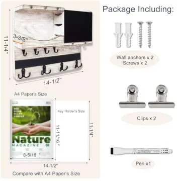 Farmhouse Key and Mail Holder for Wall Decorative, Rustic Mail and Key Organizer for Wall with Different Hooks, Chalkboard, Key Holder Wall Mount with Shelf, Basket, Clips(Pine Wood, White Washed)