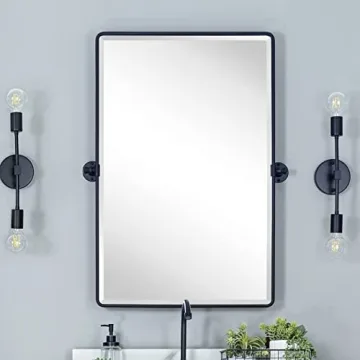 Show moreIntroducing the Farmhouse Pivot Rectangle Bathroom Mirror, a perfect blend of elegance and functionality designed to complement a wide array of bathroom styles. Crafted with a robust black metal frame that exudes strength and modern appeal, this mirror features an elegant beveled edge that enhances its sophistication. Measuring 20" x 30", it possesses an exquisite 3/4" bevel that catches the eye, adding a luxurious touch to your space. The versatility of this mirror is exceptional; it easily pivots, making it optimal for both standing and seated users, ensuring the best reflection for everyone, regardless of height.