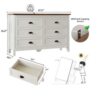 Show more Introducing the Farmhouse White Dresser for Bedroom — an elegant blend of modern design and vintage charm. Measuring a generous 47.2 inches wide x 15.7 inches deep x 31.5 inches high, this stylish dresser includes 6 spacious drawers that are perfect for organizing clothes, toys, jewelry, paperwork, and personal items. Each drawer, with a depth of 5.5 inches, slides smoothly on premium runners, making access to your belongings effortless and convenient. The broad tabletop offers ample space to showcase decorative items like lamps, plants, and photo frames, turning your room into a sophisticated haven of warmth and organization.