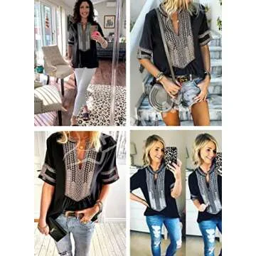 FARYSAYS Women's Clothing Summer Boho Embroidered V Neck Short Sleeve Casual T-Shirt Tops Loose Blouse Black Medium