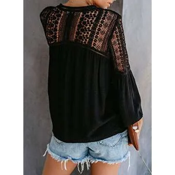 FARYSAYS Women's Clothing V Neck Lace Crochet Long Sleeve Button Down Shirts Casual Loose Tops Blouses Black Large