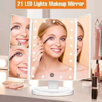 FASCINATE Trifold Vanity Mirror with Lights, Lighted Makeup Mirror 2X/3X Magnification, 21 LED Touch Dimming, Dual Power 180° Rotation Lit Beauty Table Mirror, Make up Mirror with Lighting