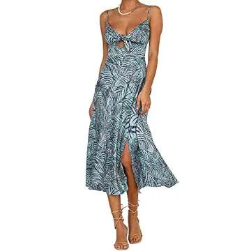 Fashionme Women Spaghetti Strap Midi Satin Dresses Tie Front Backless Split Summer Casual Floral Dress Hollow Flowy Slip Dress Sundress Wedding Guest Beach Cocktail Graduation B-Light Blue