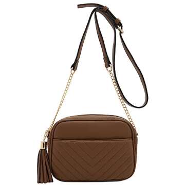 FashionPuzzle Chevron Quilted Crossbody Camera Bag with Chain Strap and Tassel (Dark Taupe) One Size