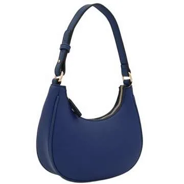 Introducing the FashionPuzzle Small Crescent Shoulder Bag in a sophisticated Navy hue, where style meets practicality. Crafted from premium PU leather, this bag not only looks chic but also ensures durability. Its sleek design, featuring gold-tone hardware, adds a touch of elegance to any outfit, making it perfect for casual outings or more formal occasions. With dimensions measuring 9" (W) x 5" (H) x 2.5" (D), it strikes a perfect balance between compactness...