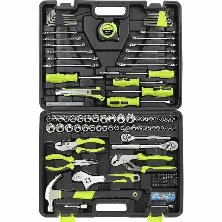 Show moreThe FASTPRO 225-Piece Household Tool Set is a comprehensive mechanics hand tool set perfect for DIY enthusiasts, home maintenance, and car repairs. Designed with versatility and convenience in mind, this tool set comes in a practical toolbox that keeps your tools organized and ready to use at a moment's notice. The set includes both SAE and metric hex tools, sockets, and wrenches, making it adaptable to a wide range of tasks. It features two sets of screwdrivers, two types of pliers, two kinds of wrenches, two sizes of ratchets, and a 12oz hammer, ensuring that you have all the essential tools within reach. Users have noted the solid quality of the tools, emphasizing their effectiveness despite the minor inconvenience of sockets falling out when the set is upright. The vibrant green color adds a touch of personality to this already impressive toolkit.