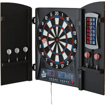 Show moreElevate your game room with the Fat Cat Mercury Electronic Dartboard, a top-tier choice for enthusiasts and casual players alike. This dartboard boasts a durable 13.5” target area with precision-engineered concave segment holes designed to lock in your shots, ensuring accuracy and longevity. The ultra-thin spider and extended catch ring enhance your scoring experience, making every throw count. With 28 games, including favorites like 01 and Cricket, and over 150 scoring options, it supports up to 8 players, making it perfect for gatherings. The sleek built-in cabinet doors not only add to its aesthetic appeal but also provide convenient storage for six soft tip darts, keeping your setup organized. Included are six starter soft tip darts, mounting hardware, six spare tips, and an AC adapter, offering everything you need to start playing right away.