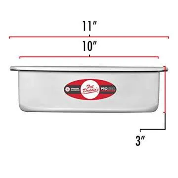 ... Show moreIntroducing the Fat Daddio's PSQ-10103 Anodized Aluminum Square Cake Pan, a must-have tool for both novice bakers and seasoned pastry chefs alike. Crafted specifically to master any cake recipe, this versatile 10 x 3-inch pan is designed to effortlessly accommodate your favorite square tiered and layered cakes, brownies, blondies, pastries, and bar-type cookies. With precise measurements of 10" x 10" x 3" (25.4 x 25.4 x 7.6 cm), it is ideal for baking generous portions that satisfy any craving.