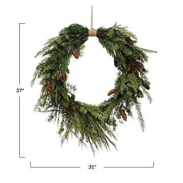 Show moreCreate a warm and inviting atmosphere this holiday season with our stunning Faux Pine Wreath with Pinecones & Wrapped Jute Hanger. This beautifully crafted wreath adds a touch of nature effortlessly to your festive décor without any seasonal maintenance. Measuring an impressive 31 inches wide by 37 inches high, this striking piece is constructed from high-quality plastic, ensuring durability year after year. The lifelike faux pine needles and charming pinecones beautifully replicate a fresh wreath, allowing you to impress your guests before they even step into your home.