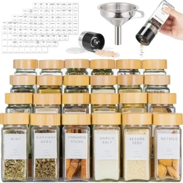 Show moreTransform your kitchen into a culinary haven with the FavorFlavor 24 Pcs Spice Jars Set. Crafted from thickened food-grade glass, these jars are not only BPA and lead-free but also designed to keep your spices fresh and flavorful. The elegant bamboo lids offer an airtight seal, ensuring your ingredients stay dry and aromatic. This set includes 24 spice jars, 135 pre-prepared labels, and 25 blank labels for your custom spices, making organization a breeze. The separate shaker tops prevent spillage, keeping your kitchen tidy. With a sleek design and transparent glass for easy visibility, these jars are a must-have for any cooking enthusiast. The included metal funnel simplifies refilling, making this set as practical as it is beautiful.