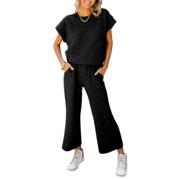 Fazortev Women's 2 Piece Outfits Quilted Lightweight Short Sleeve Tops and Cropped Pants Lounge Set Black