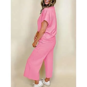 Fazortev Womens 2 Piece Outfits Sweatsuit Short Sleeve Tops and Drawstring Waist Cropped Wide Leg Pants Loungewear Sets Pink