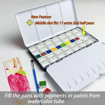 The palette also boasts two large fold-out mixing areas, alongside an additional mixing space that can be accessed by removing the tray, expanding creative possibilities with its functionality. The watercolor half pans themselves are designed with a thin wall, optimizing space without compromising capacity, each providing 2ml of paint.
