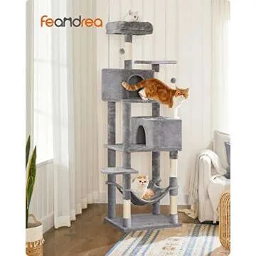 Show moreElevate your feline lifestyle with the Feandrea Cat Tree, a luxurious 75.2-inch cat tower that transforms any indoor space into a feline paradise! Designed with both comfort and activity in mind, this stunning cat condo features two spacious perches for sunbathing, two cozy caves for snuggling, and a delightful hammock for ultimate relaxation. Crafted with premium materials, your kitties will adore their new sanctuary as much as you love the stylish addition to your home.