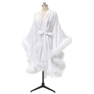 Feather Robes Fur Bridal Robe Lingerie Bathgown Short Ruffle Silk Satin Maternity Photoshoot for Women Blush+White Small/Medium