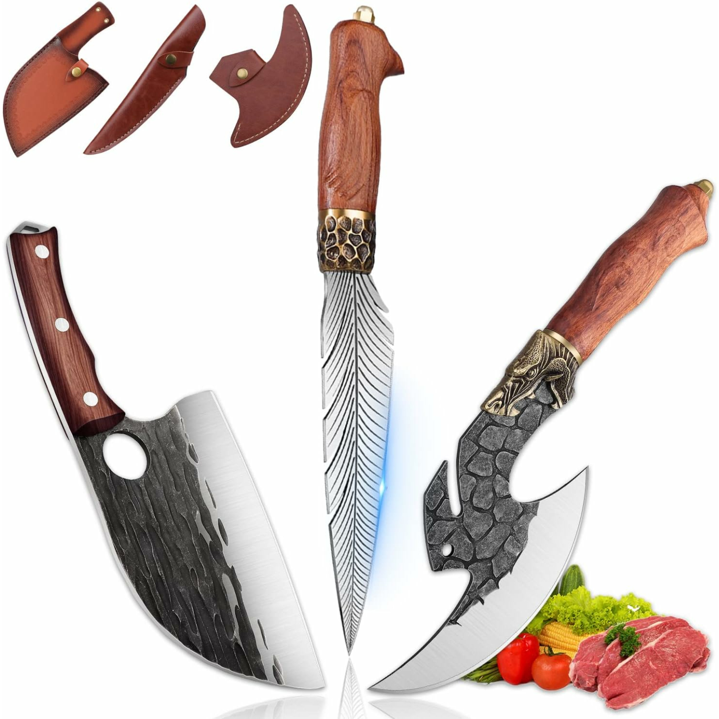 The Feather Viking Serbian Chef Knife Dragon Cleaver Set is a remarkable addition to any kitchen enthusiast's collection. Forged in Fire, this high carbon steel kitchen cutter set includes a unique array of knives designed for various culinary tasks. Each knife in the set features a distinctive design, with the dragon cleaver standing out due to its impressive appearance reminiscent of ancient Viking tools. This set is not only functional but also visually appealing, making it a standout piece in any kitchen. Perfect...