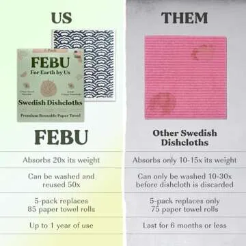 FEBU Swedish Dishcloths for Kitchen | 5 Pack Eastern Reusable Paper Towels Washable | Swedish Dish Towels | Non-Scratch Cellulose Sponge Cloths | No Odor, Biodegradable Cleaning Cloths