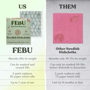 FEBU Swedish Dishcloths for Kitchen | 5 Pack Stamps Reusable Paper Towels Washable | Swedish Dish Towels | Non-Scratch Cellulose Sponge Cloths | No Odor, Biodegradable Cleaning Cloths