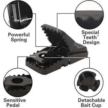 Show more The ultimate solution for your pest problem is finally here with our innovative mouse traps! These state-of-the-art traps are designed for maximum efficacy and unparalleled safety, ensuring you never have to worry about gruesome cleanup or finger injuries. With a clever no glue, no touch design, these traps provide a hygienic way to catch mice without any mess or fuss. Simply bait the trap with your preferred bait, and watch as its sensitivity wrangles even the most cautious intruders, thanks to its 0.025 lbs trigger weight.