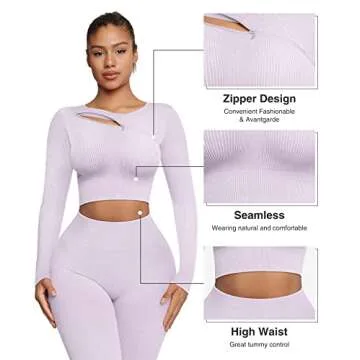 The distinctive design of the **long sleeve crop top** stands out with its stylish front zipper. The **silver zipper** contrasts beautifully with the energetic light purple, adding a modern flair to your activewear collection. Do away with any restrictions, as the **no-thumbhole design** ensures that your arms are free to move without binding, putting comfort first. Paired with **seamless knitting**, this top doesn’t just serve functionality but elevates your style, making it a great choice for both workout sessions and casual outings.