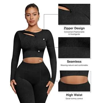 FeelinGirl Workout Sets for Women Long Sleeve 2 Piece Yoga Outfits Seamless Ribbed Zipper Crop Top High Wasit Legging Sets Black 2XL