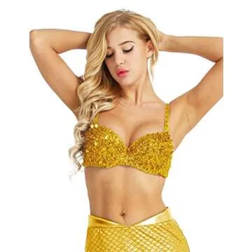 FEESHOW Women's Tribal Glitter Sparkle Belly Dance Beaded Sequined Bra Top for Rave Cabaret Party Gold 34/75