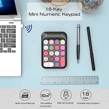 Show more Introducing the ultimate companion for your productivity needs - our Wireless Numeric Keypad. This sleek and stylish device, crafted by a leading brand in ergonomic technology, exemplifies simplicity and functionality. With its plug and play design, setting up the keypad is a breeze; just plug the USB into your computer and you're ready to go without any cumbersome software installations. Whether you’re crunching numbers in spreadsheets or managing financial applications, the 18 full-size quiet keys provide a premium typing experience that ensures precision and control at your fingertips.