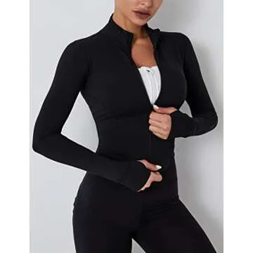 Fenclushy Womens Cropped Slim Athletic Yoga Workout Track Sports Zip Up Jacket with Thumb Holes(Black,XL)