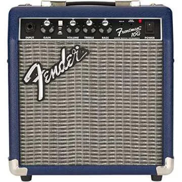 Show more Fender Frontman 10G Guitar Combo Amplifier - Midnight Blue Bundle is the ultimate practice amplifier for musicians at any level. With its 10-watt output, this amp offers just the right amount of power to practice at home without overwhelming volume. Perfectly designed for both electric guitars and acoustic guitars, this combo amplifier delivers rich, warm tones thanks to its closed-back construction, enhancing bass response for a fuller sound that will elevate your playing experience. Additionally, the included bundle features an instrument cable and a 12-pack of Austin Bazaar Exclusive picks, ensuring you have everything you need to start playing right from the box.