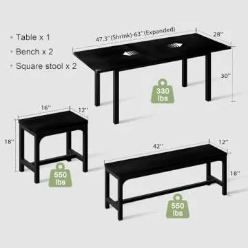 Designed to maximize space in smaller homes, each component of this set, including benches and stools, tucks conveniently under the table when not in use, optimizing your living area for family activities. Its chic aesthetic complements any home decor, making it a fitting centerpiece for your kitchen, dining area, or even commercial spaces like cafes or bistros.