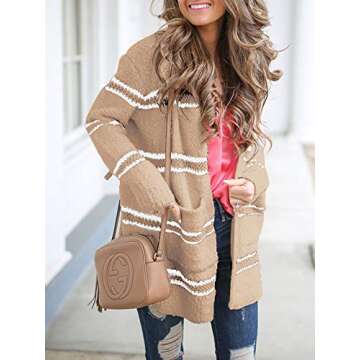 FERBIA Women Fleece Cardigan Striped Boyfriend Sweaters Long Sleeve Open Front Loose Knit with Pockets Khaki