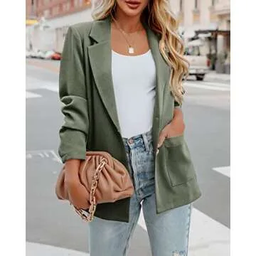 Show moreIntroducing the FERBIA Women's Casual Blazer Jacket, a perfect blend of style and comfort. This stylish blazer features a sophisticated button-down design and an open-front style that effortlessly enhances your work wardrobe. Made from high-quality materials, this army green lapel coat is not only a statement piece but also incredibly versatile. With long sleeves and practical pockets, it is designed to provide you with both functionality and a touch of elegance at the office or on casual outings.