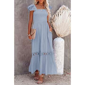 Ferlema Women's Summer White Maxi Dresses Summer Casual Square Neck Sleeveless Ruffle Beach Long Dress Light Blue Small