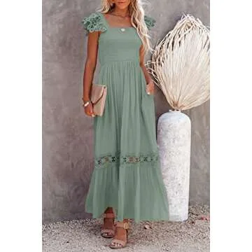 Adorned with lovely crochet lace trim along the hem and detailed lace sleeves, this summer beach maxi dress combines both sophistication and a hint of bohemian flair. Its elastic high waist further enhances your silhouette, ensuring you look and feel your best at any occasion. Perfectly lined inside, this dress ensures that you won’t have to worry about discomfort or transparency, allowing you to enjoy your summer outings with confidence.