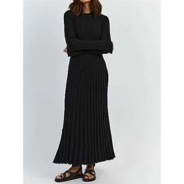 Fernvia Bodycon Knit Dress for Women Long Sleeve Crew Neck Ribbed Solid Fall Long Maxi Going Out Dress (A-Black, S)