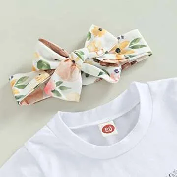 Show more Introducing the Fernvia Toddler Baby Girl Easter Outfits, the perfect ensemble to celebrate your little one's first Easter in style! These outfits are expertly crafted from a high-quality cotton blend that ensures a soft, comfortable, and breathable fit for your baby girl. Designed not only for aesthetics but also for wearability, this delightful set includes a short-sleeve t-shirt adorned with a unique letter design that adds a funny and cute touch, making it an instant favorite for both kids and parents. The accompanying flared bell bottom pants feature an elastic waist for a perfect fit, creating a trendy and playful look that is sure to turn heads this Easter.