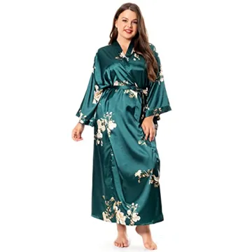 Show more Indulge in luxurious comfort with the feslieacc Women's Plus Size Silk Robes, expertly crafted for elegance and ease in dressing. Made from the finest quality satin, this plus size long robe provides a delightful sensation against your skin, making it perfect for a cozy evening at home or a refreshing after-bath experience. The beautiful floral prints adorn the dark green fabric, bringing a touch of sophistication to your loungewear. Whether you like to unwind with a book or get ready for an event, this is the robe you will reach for time and time again.