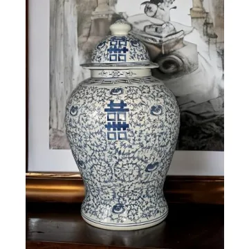 Show more Introducing the exquisite Classic Blue and White Porcelain Floral Double Happiness Temple Jar Vase by Festcool, a stunning representation of traditional Ming style craftsmanship. Standing at an impressive 19 inches high with a generous diameter of 11 inches, this vase is not just a decorative piece; it's a captivating statement of elegance and culture. Adorned with an intricately designed double happiness symbol, it signifies joy and prosperity, making it a perfect addition to any space. Its vibrant hues and classic patterns are sure to draw admiration from anyone who lays eyes on it.
