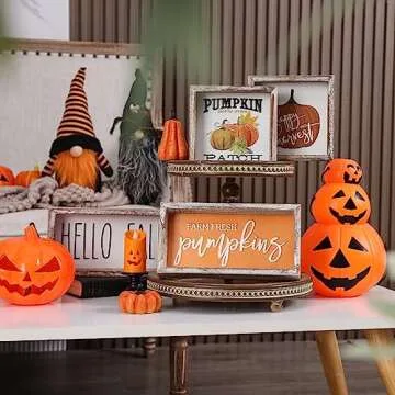 Show more Transform your home this season with the FESTWIND Fall Home Decor. This beautiful Happy Harvest Pumpkin Block Sign combines rustic charm with modern design, featuring a unique fusion of high-quality wood and embossed metal. Perfect for enhancing your fall aesthetic, this versatile decoration is ideal for shelves, mantels, tables, and even tiered trays. With its eye-catching design, it effortlessly complements various decor styles while creating a warm, inviting atmosphere.