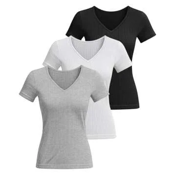Ficerd 3 Pack Women's Short Sleeve Cotton T-Shirts V Neck Ribbed Slim Fit Tops Ladies' Casual Summer Basic Tee(Black, White, Light Gray,S)