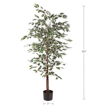 Show moreTransform your living space with the stunning Ficus Artificial Tree by Pure Garden. This exquisite 5-foot-tall topiary features realistic variegated leaves adorned with striking green and white tones, mimicking the beauty of a real ficus plant. Whether you're looking to enhance your living room, bedroom, or office, this faux plant is the ideal solution for adding a vibrant touch to any area of your home or business without the hassle of maintenance. It's designed to seamlessly blend with various decor styles, making it as versatile as it is beautiful.