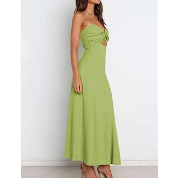Fiemaoves Sexy Twist Front Strapless Sweetheart Neckline Midi Dresses for Women Smocked Cutout Tube Linen Dress Wedding Guest Sage