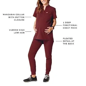 This maternity scrub top is finished with a stylish mandarin collar and features a button closure, ensuring you maintain a polished appearance even in the hectic world of healthcare. The flattering curved high-low hem, combined with pleated detail at the back, offers a chic look while providing ample coverage. Available in a rich burgundy color, the FIGS Kitale Maternity Scrub Top not only fulfills your comfort requirements but is also tailored to reflect a professional aesthetic.