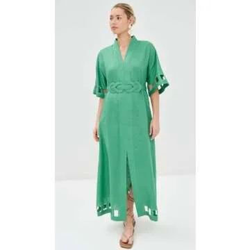 Show moreIntroducing the stunning Figue Women's Adalaide Dress in a vibrant apple green hue, a piece that beautifully combines classic elegance with modern sensibility. Crafted from a mid-weight, non-stretch linen weave, this dress is designed to be perfect for sunny days and warm evenings, ensuring you stay comfortable while looking chic. The ladder cutout trim adds a unique touch that enhances the dress's sophisticated design, making it a standout piece in any wardrobe. Featuring a flattering V-neck and elbow-length sleeves, the Adalaide Dress is tailored to create a timeless silhouette that accentuates your figure while providing ease of movement. The front slit lends a playful hint of allure, allowing you to show off your favorite pair of heels or sandals. Overall, this unlined dress is not only visually striking but also functional, allowing for breathability and comfort wherever your day takes you.