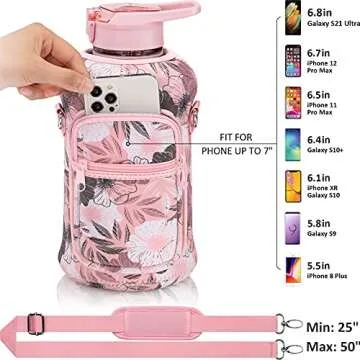 Fimibuke Half Gallon Water Bottle with Sleeve 64 OZ Water Bottle with Handle & Straw Leakproof Motivational Sports Gym Water Bottle with Time Marker Water Jug with Neoprene Holder - Floral Pink